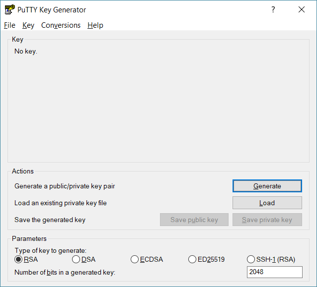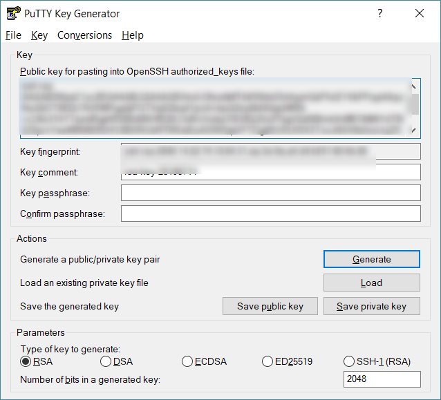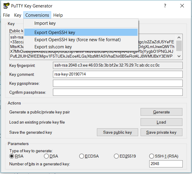 Conversions에서 Export OpenSSH key를 하면 비밀키를 저장할 수 있습니다.