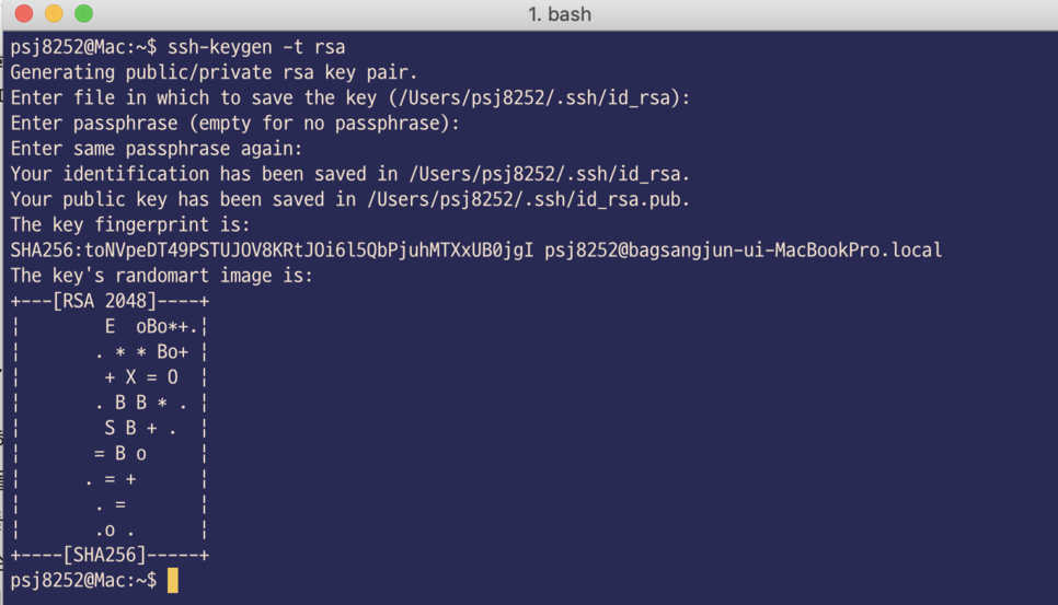 Your identification has been saved in /Users/psj8252/.ssh/id_rsa. Your public key has been saved in /Users/psj8252/.ssh/id_rsa.pub.