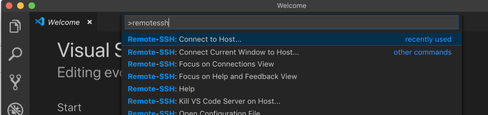 그 다음에 Remote-SSH: Connect to Host... 을 눌러줍니다.