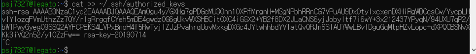 그 다음에 cat >> ~/.ssh/authorized_keys 를 쳐준다음에 아까 복사한 것을 붙여넣습니다.